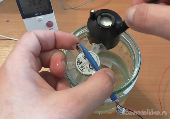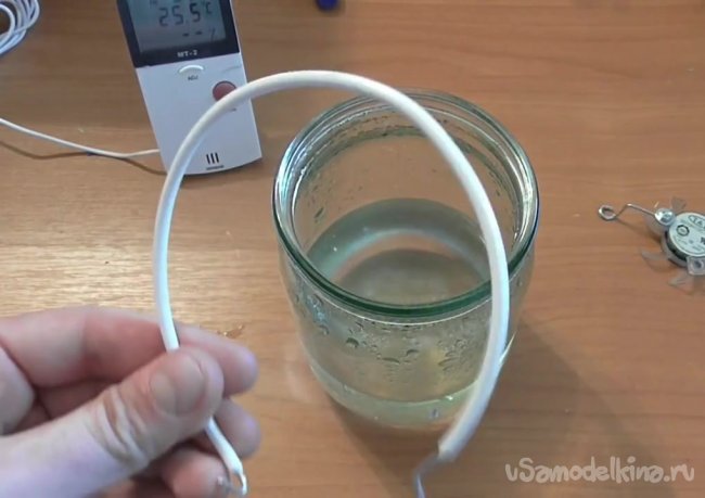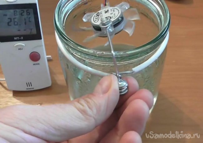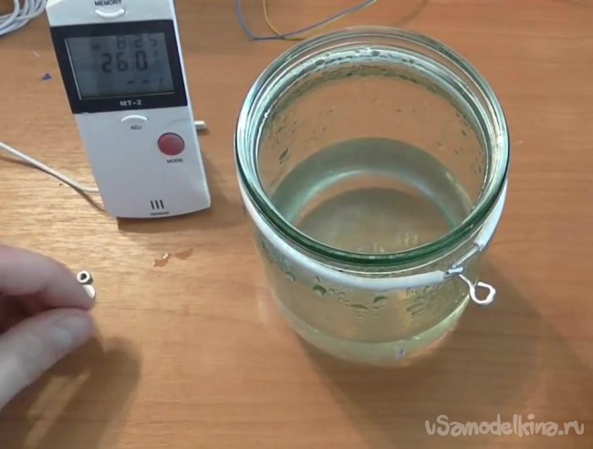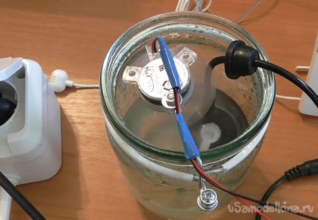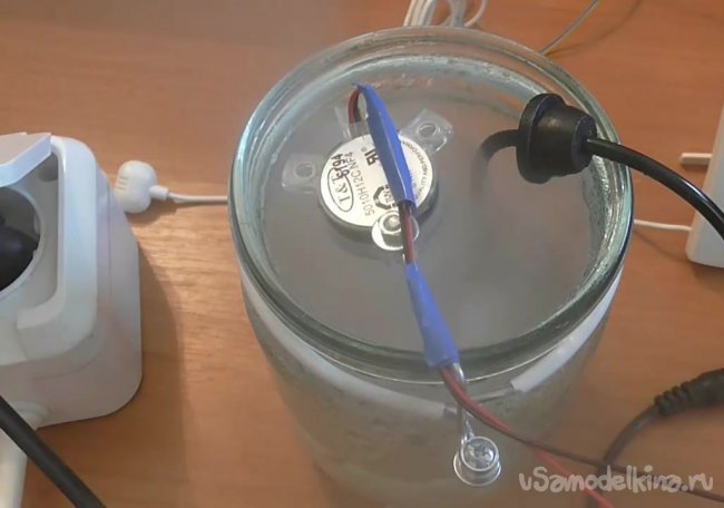 Теперь опускаем в банку с водой ультразвуковое устройство.