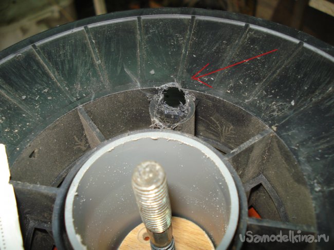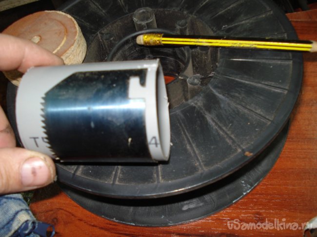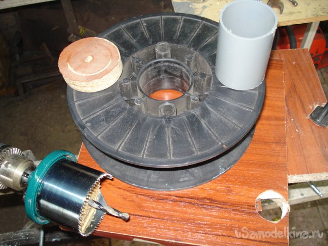 Сверлом №3 сверлим ПВХ панель (ламинат), полученный кружок сверлим сверлом №2 , получается кольцо, оно должно надеться на трубу, следом надеваем катушку.