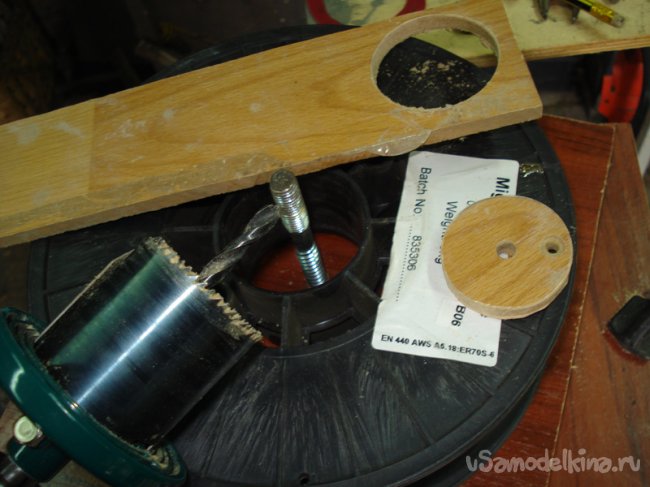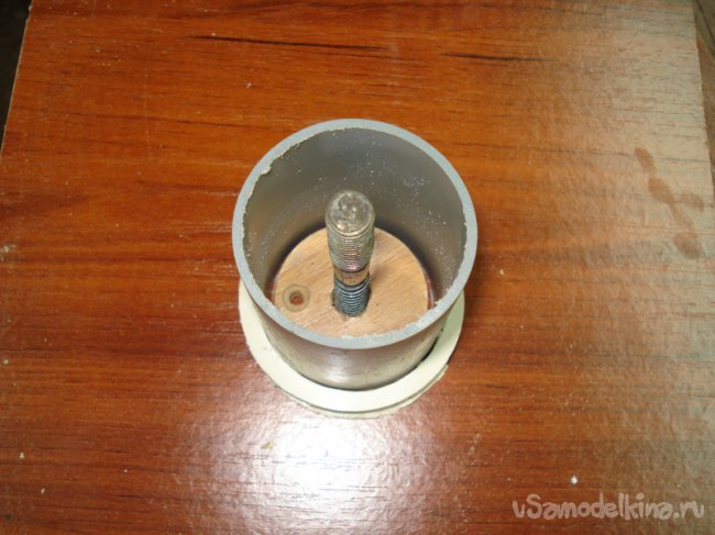 Первым сверлом изготавливаем из куска ЛДСП или ламината несколько центрирующих шайб для трубы, надеваем их на шпильку и следом надеваем трубу втулку.