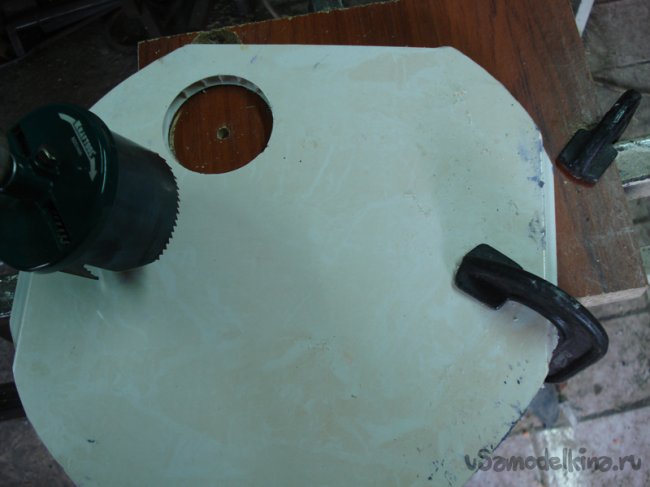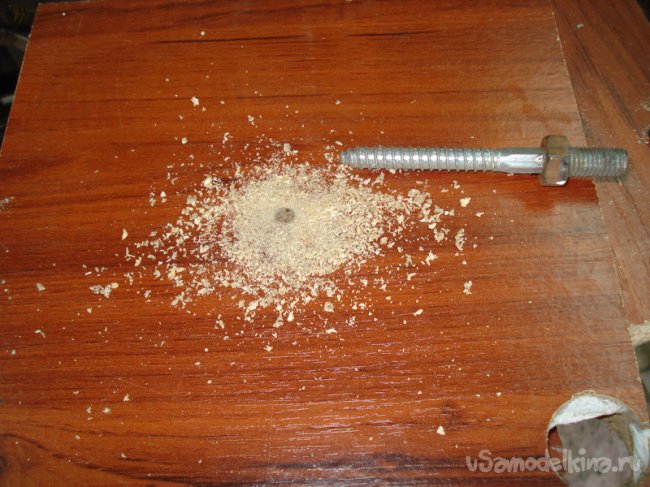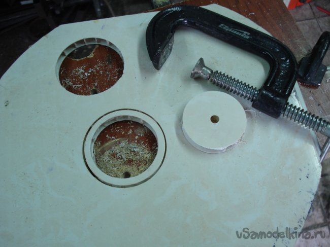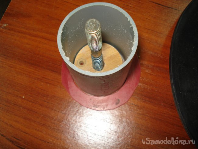 Отпиливаем ЛДСП размером 300*300 мм, сверлим по центру отверстие для вкручивания шпильки (шурупа), в зависимости от того что у Вас нашлось.