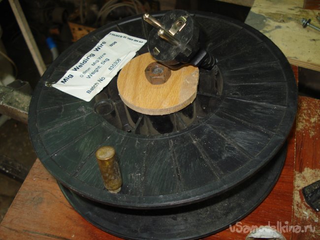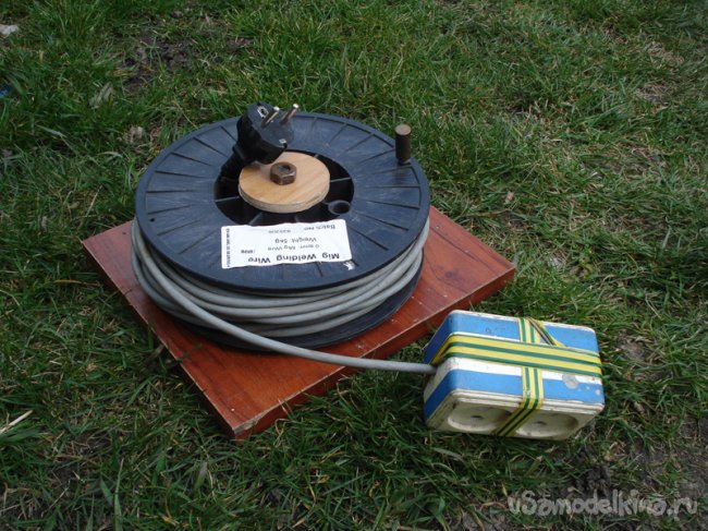 Для провода делаем отверстие в катушке, немного больше чем диаметр нашего провода. Просовываем изнутри провод и присоединяем вилку, с другой стороны одну или несколько розеток.