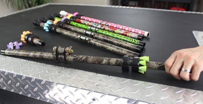 Шаг 6: В конце на ружье устанавливаем лазерную указку. Вырезаем кусок ПВХ трубы по длине лазерной указки и проделываем отверстие для включения. И обматываем камуфляжным скотчем.