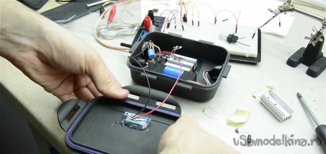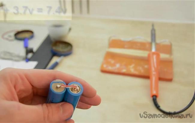 Подсоединяем аккумуляторы последовательно, получив напряжение в 7.4 вольт.