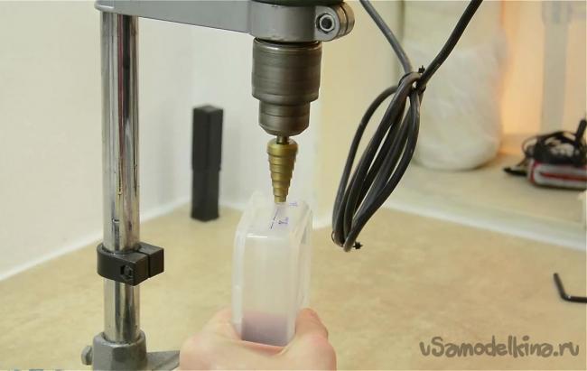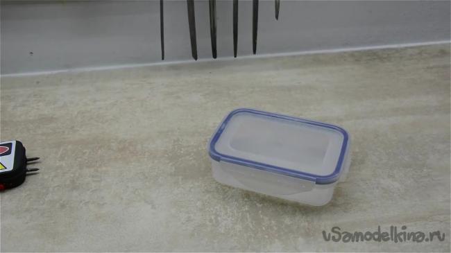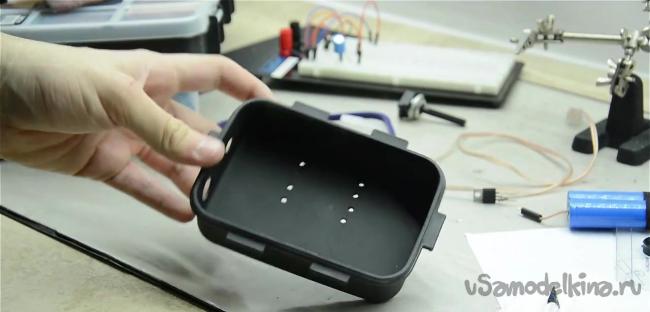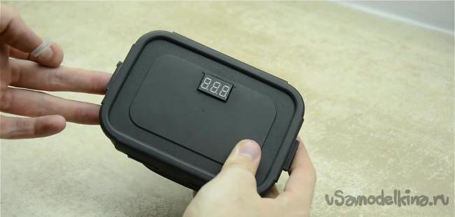 Для отображения напряжения прожектора будет использован цифровой вольтметр, под который также необходимо сделать отверстие на пищевом контейнере.