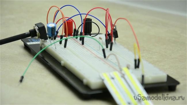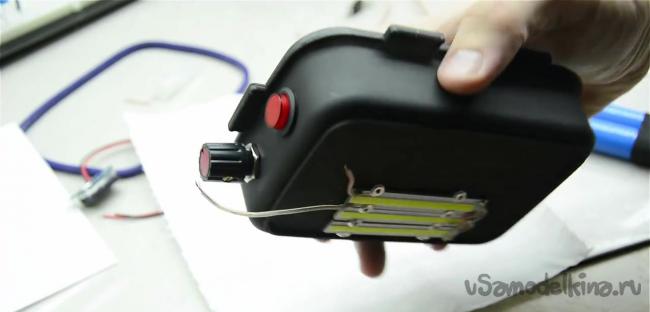 Прожектор готов. Владелец имеет полное преимущество регулировать уровень освещения при помощи потенциометра. А сам прожектор может быть использован в качестве накамерного света. При этом следует отметить, что отсутствие импульсной регулировки позволяет получать картинку без каких-либо мерцаний.
