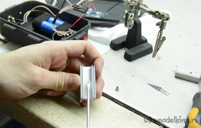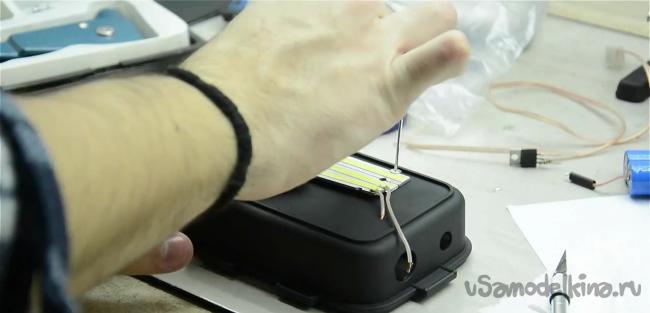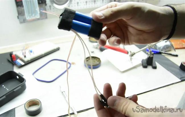 Припаиваем 4 провода к аккумуляторам. Два из них должны подключиться к схеме, а остальные два будут использоваться для зарядки аккумуляторов.
