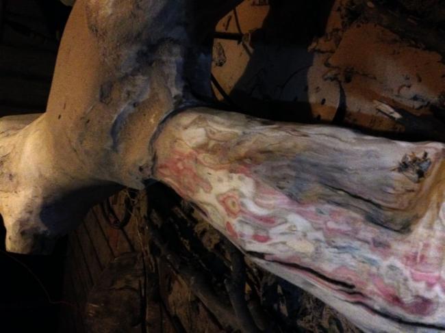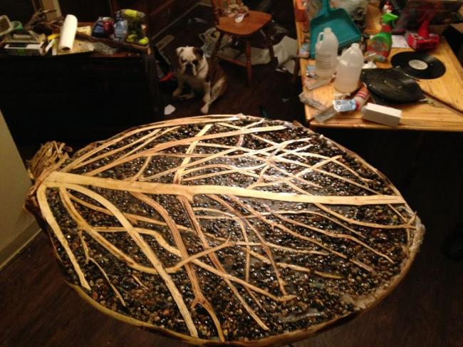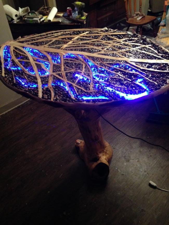 Шаг 5: Займемся декорацией. Столешницу и ножку нужно покрыть лаком. По желанию можно установить светодиодную ленту. В промежутки между деревьев нужно приклеить мелкую гальку на эпоксидную смолу, в таком случае поверхность стола будет гладкой.