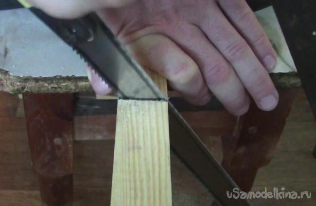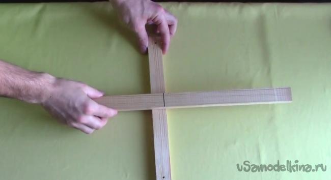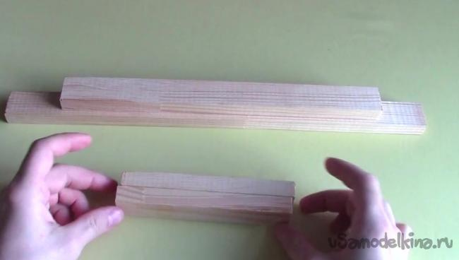 Берем планку, которую необходимо использовать для вырезания четырех заготовок. Длина первой заготовки должна быть равна 43 см, второй – 31 см. Остальные две заготовки должны быть равны 15 см.