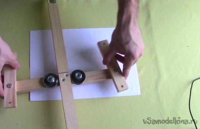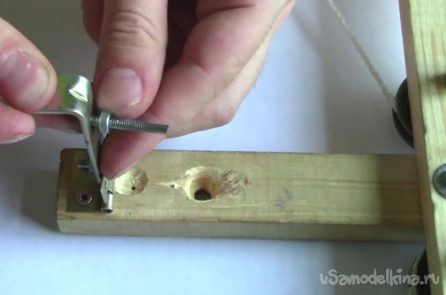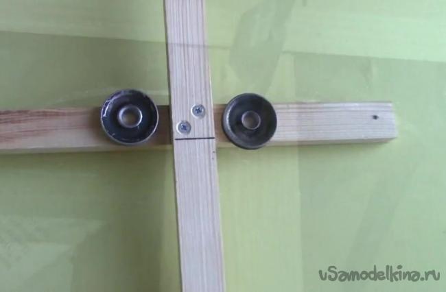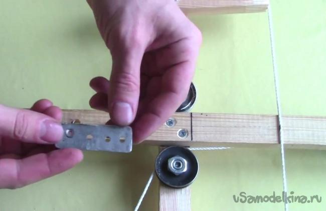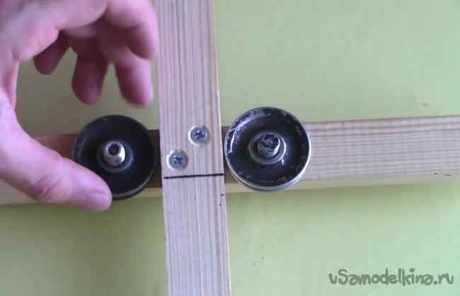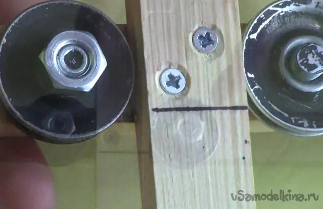 Теперь берем два ролика, которые также использовали для изготовления блочного лука, и закрепляем при помощи болтов рядом со средней планкой, как это показано на рисунке ниже.