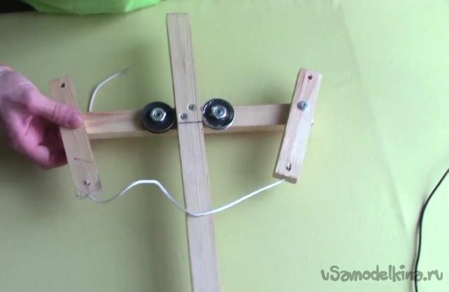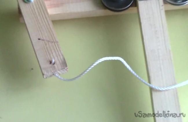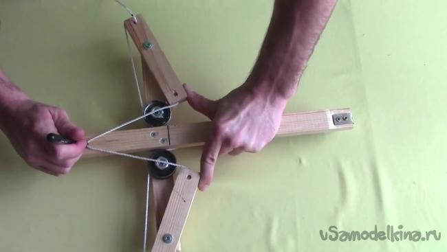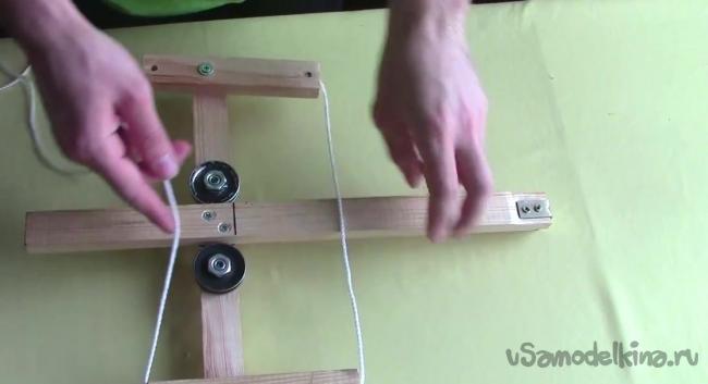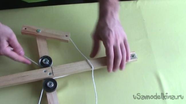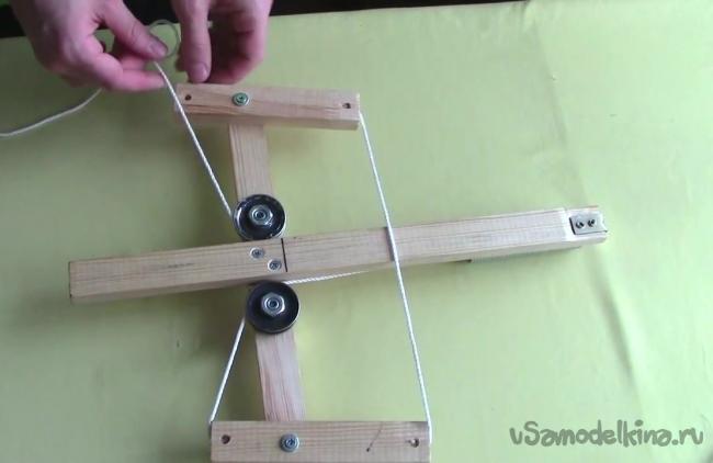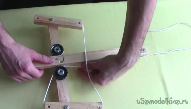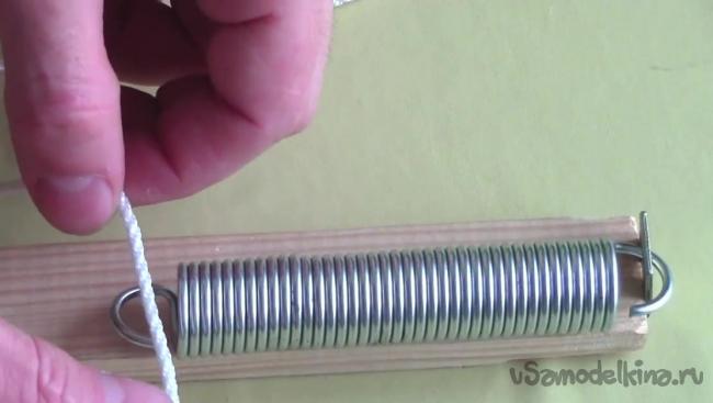 Далее берем еще один отрезок веревки, крепим его к одному из плеч, продеваем через ролик, после этого через пружину, через второй ролик, прикрепляя в конце ко второму плечу. Длина веревки должна быть такой, чтобы пружина с трудностью доходила до ее середины.
