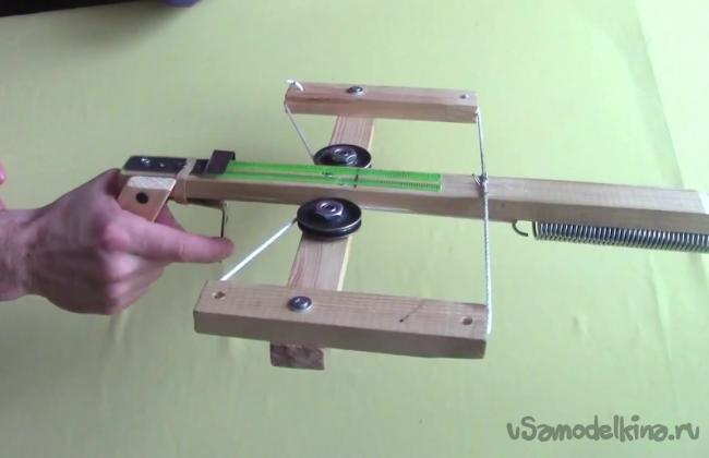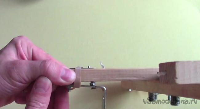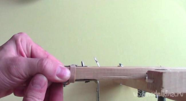 Перейдем к изготовлению спускового механизма. Для этого полностью натягиваем тетиву арбалета и делаем отметку в конечной точке.