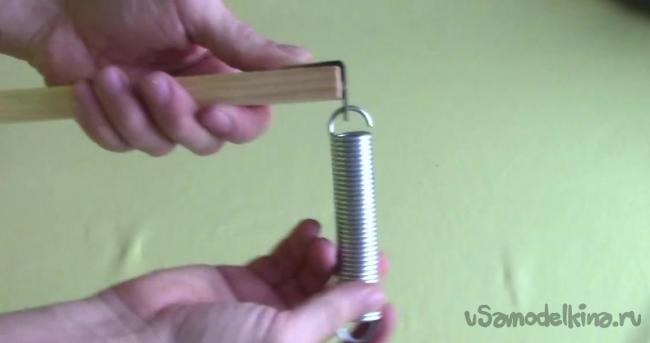 После этого берем пружину, которую также можно приобрести на авторынке, и закрепляем ее на арбалете при помощи металлического уголка.