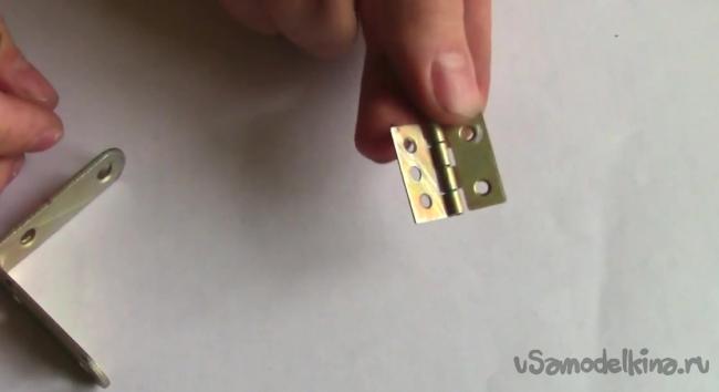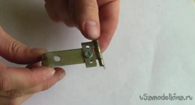 Берем дверную петлю и соединяем ее с металлическим уголком при помощи болта.