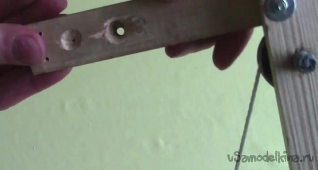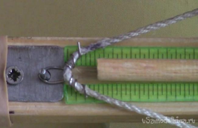 Берем отрезок капроновой веревки и закрепляем его на плечах арбалета, используя сквозные отверстия. Таким образом, соединяем плечи между собой.