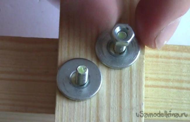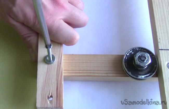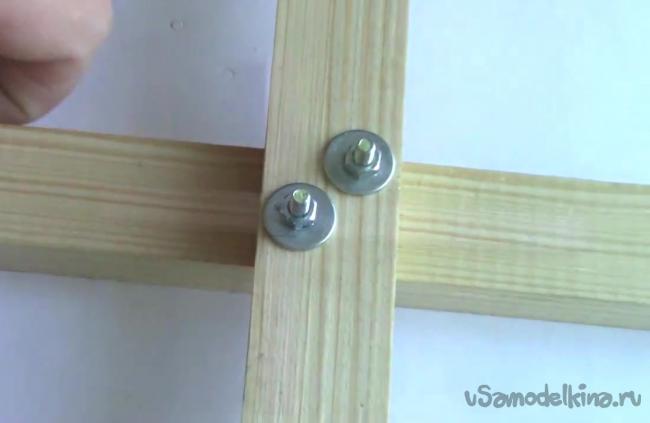 Далее к самой длине планке на отметке 25 см закрепляем среднюю планку. Делать это будем при помощи болтов, шайб и гаек.