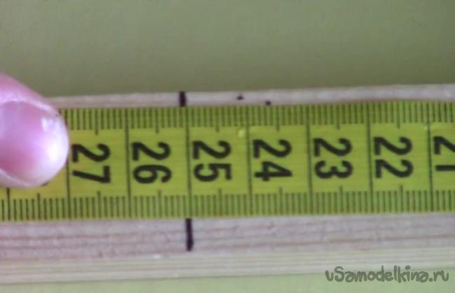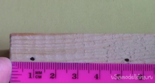 Далее возьмем две короткие заготовки и из каждого края делаем отметки на 1 см. Также с одного края обеих заготовок делаем по одной отметке в 5 см.