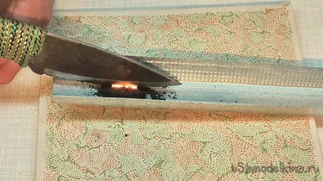 В одном из прошлых материалов мы представили обзор видеоролика по изготовлению ножа из пилы. Такой нож имеет толщину клинка 3 мм и если прогреть его до нужной температуры и резко остудить для закалки, то скорее всего клинок выкрутит в пропеллер, или нож попросту лопнет. Поэтому предлагаем обзор видео по закалке такого ножа в графите. По словам автора идеи, закалка в графите имеет преимущество в том, что нагрев требуется только на режущей кромке клинка.