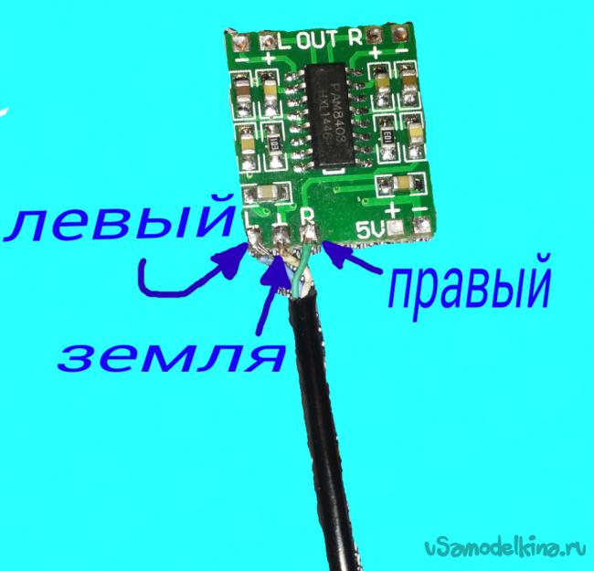 Первым делом припаяем вход звука, это джек 3.5 мм, например их старых или сломанных наушников. Базовый это белый провод, зеленый и синий, правый и левый вход звука к усилителю.