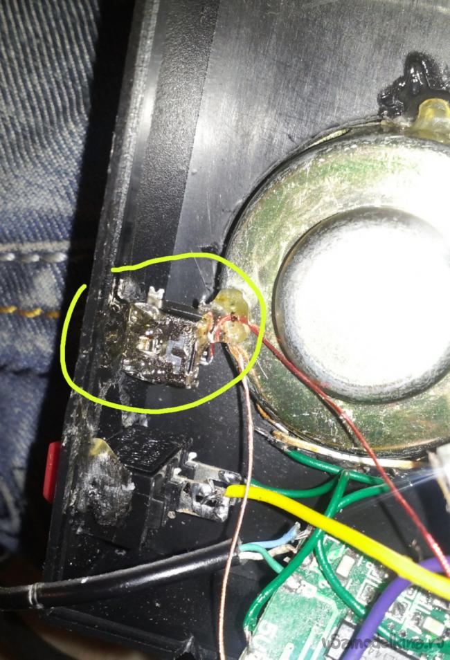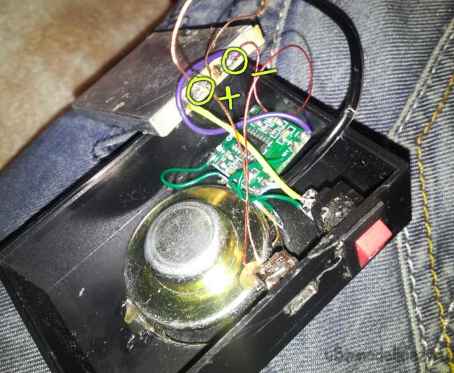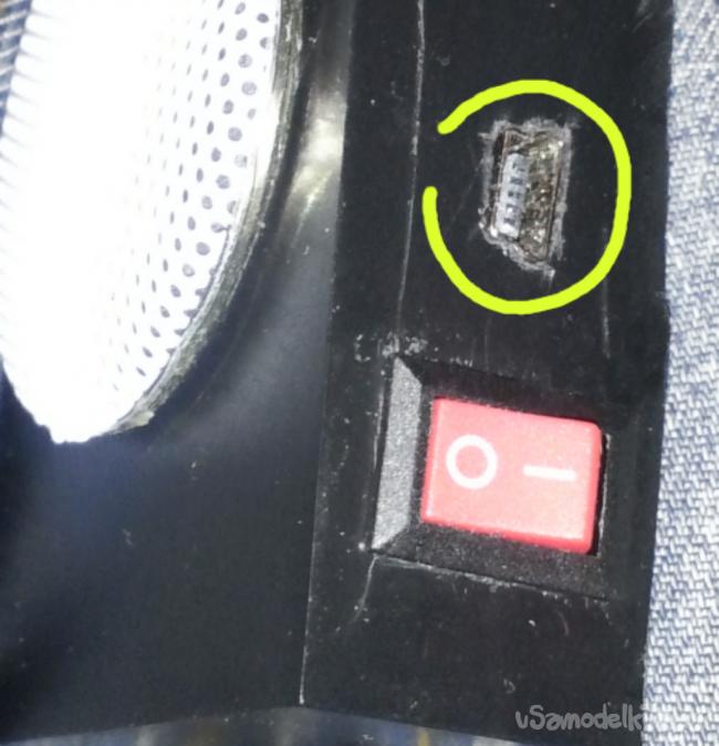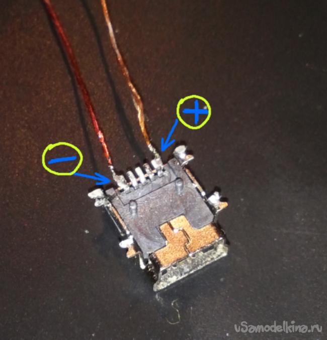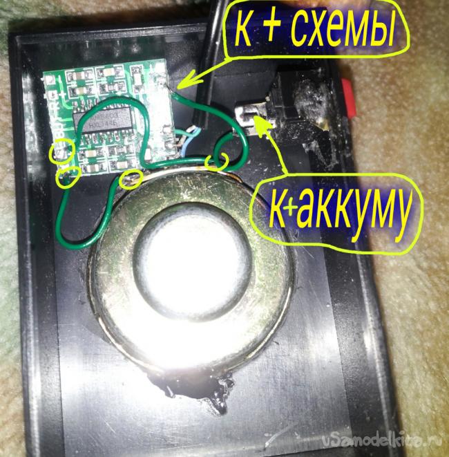 Тут же припаиваем питание усилителя на плюс аккума через включатель. Для подзарядки сделаем гнездо USB.