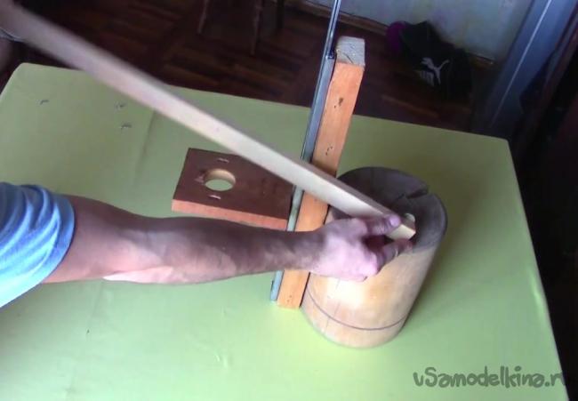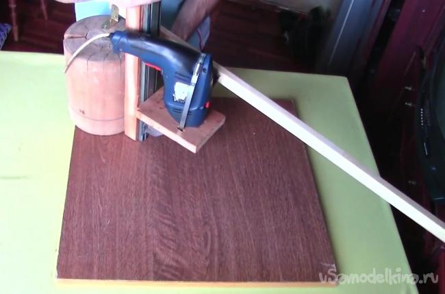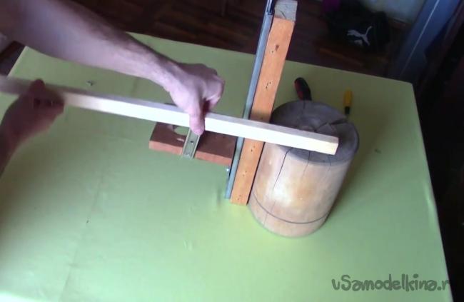 Первым делом необходимо прикрепить деревянную планку на основе. Желательно брать основу потяжелее, чтобы станок держался хорошо.