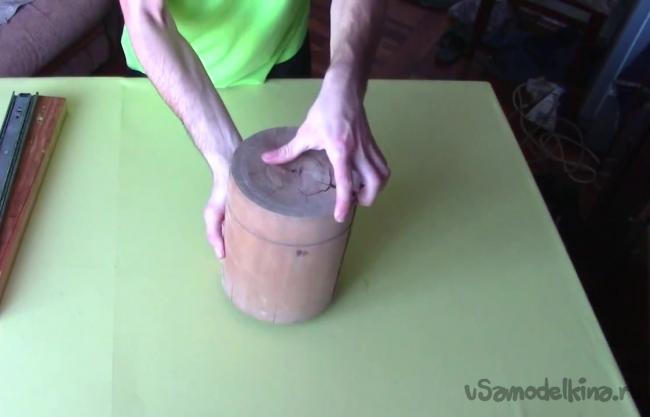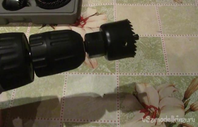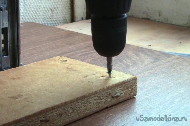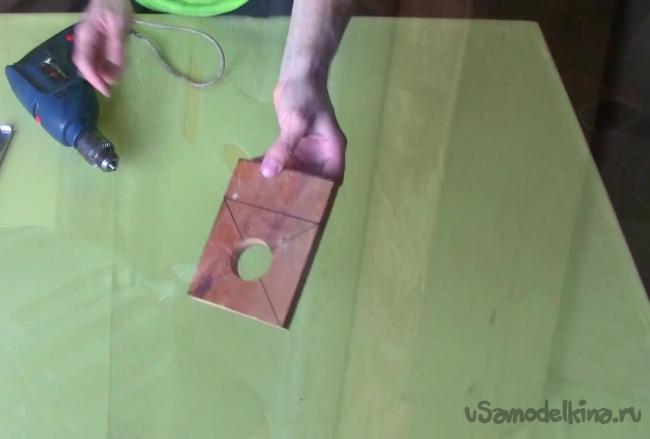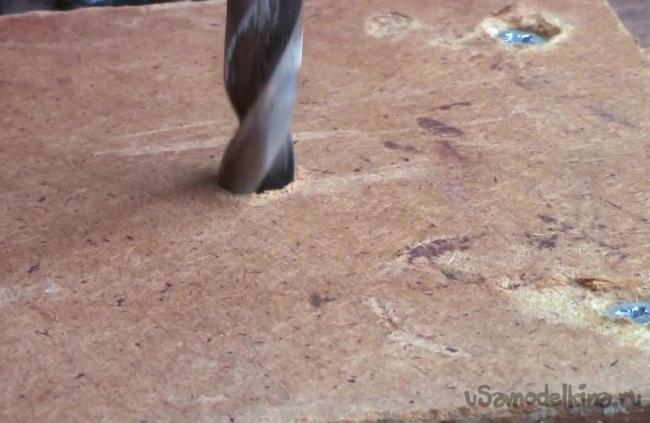 После этого берем деревянную доску и просверливаем на ней отверстие по диаметр дрели. Это можно сделать насадкой для фрез.