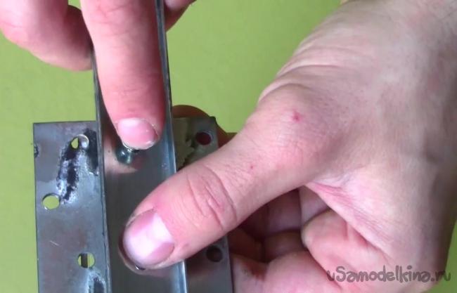 Следующим шагом возьмем металлический уголок и в одной стороне крепим металлическую пластинку.