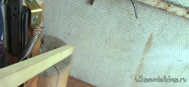 В самом конце берем пружину, которой соединяем платформу со стойкой и прикрепляем на основе кусок доски, проделав на нем углубление. Эта доска будет служить подставкой для станка.