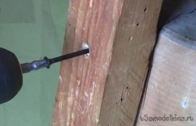 Прикрепляем к уголке деревянную рукоять при помощи самореза.