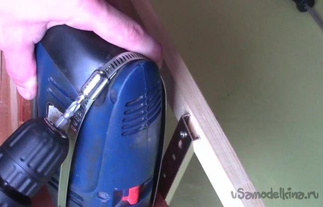 Закрепить дрель на платформе можно с помощью металлического хомута.