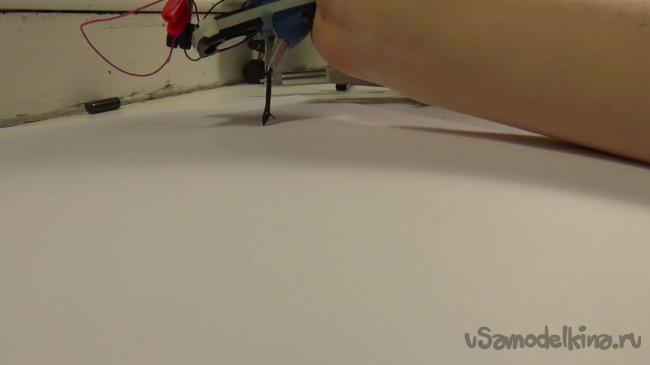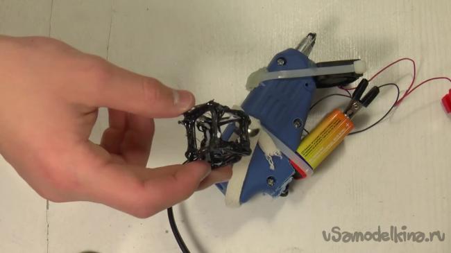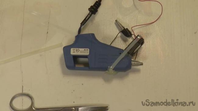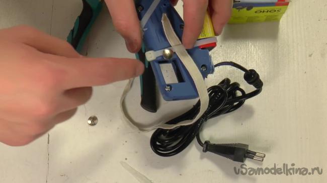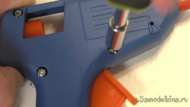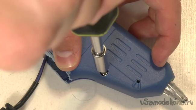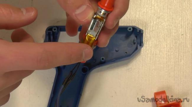 Нагревательный элемент нужно опять засунуть внутрь пистолета. Чтобы провод, идущий от нагревательного элемента случайно не вырвался, его можно заклеить.