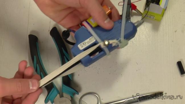 Теперь к ручке нужно прикрепить аккумуляторную батарейку. Ее также можно закрепить хомутом.