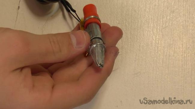Кулер нужно прикрепить на саму ручку при помощи хомутов. Чтобы хомут лучше держался, на корпусе ручки можно сделать неглубокий пропил. Кулер нужно прикрепить так, чтобы он дул в сторону носика.