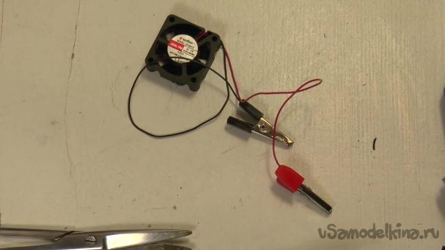 К проводкам, идущим от кулера, нужно прикрепить крокодильчики. По словам автора, он использует крокодильчики только для того, чтобы не морочиться с пайкой, поэтому при их отсутствии можно легко воспользоваться паяльником.