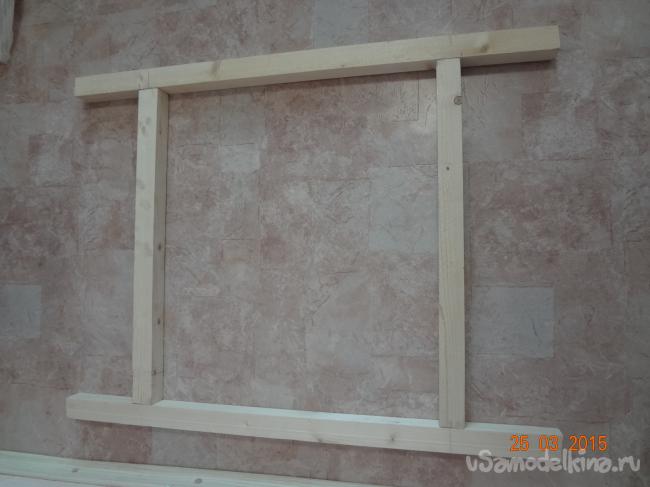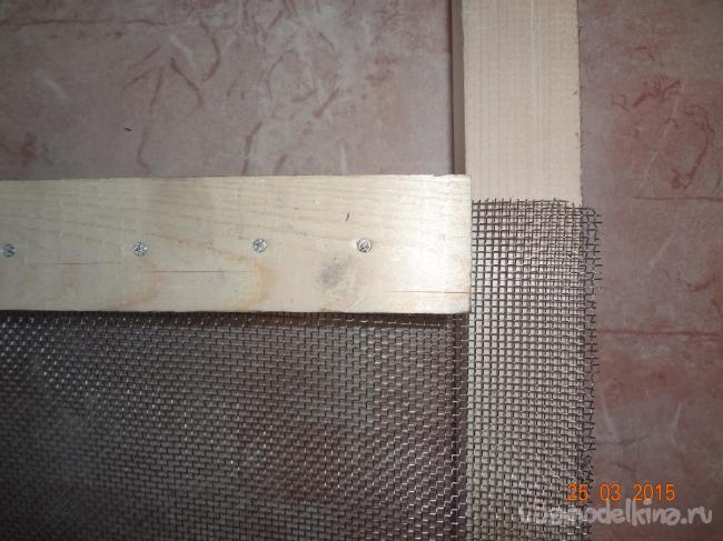 Теперь необходимо закрепить сетку, для этого прибиваем гвоздями 40 мм брусок 20х40х600 мм к полученной выше конструкции.