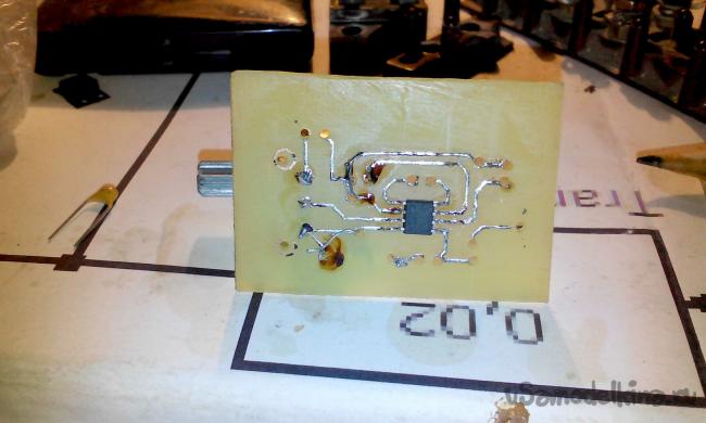 Далее печатаем на лазерном принтере и переводим рисунок на текстолит, травим плату и лудим ее, затем сверлим отверстия.