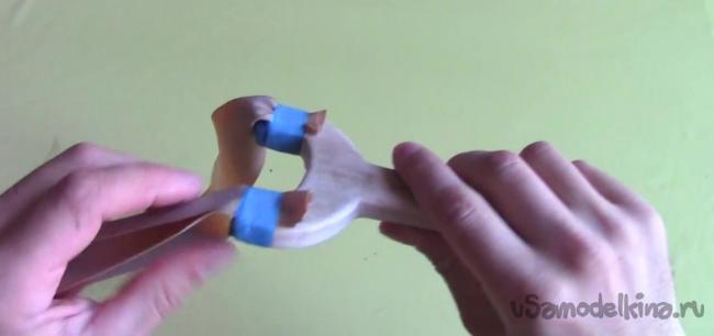 Теперь можно закрепить резину на рогатке, но перед этим необходимо обмотать ее рога изоляционной лентой.