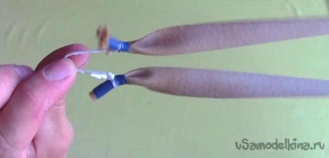 Прислоняем тяжи к рогам и тоже обматываем их изолентой.