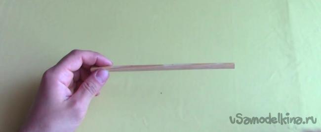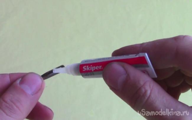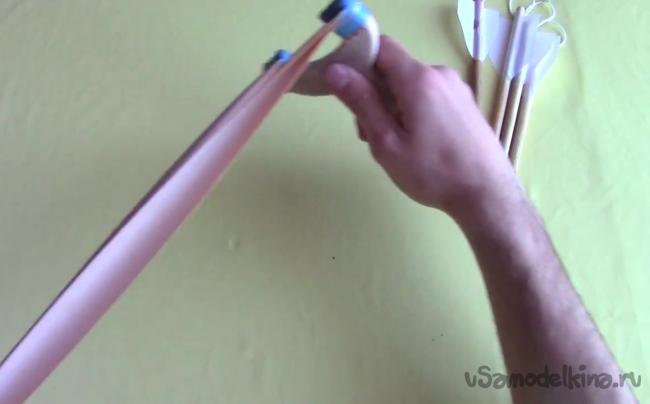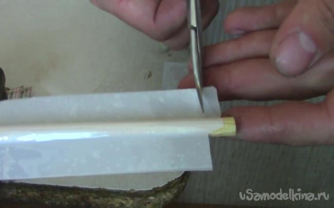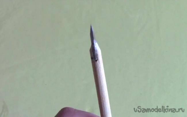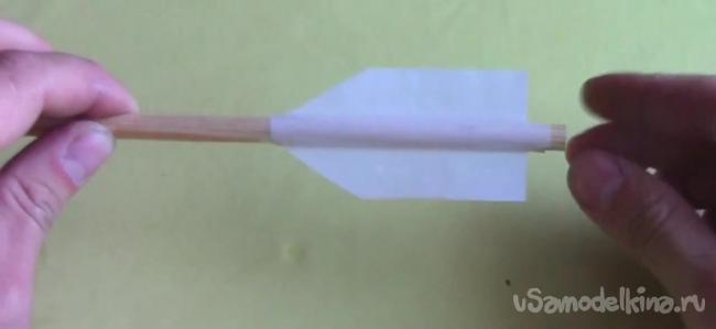 Приклеиваем вырезанный наконечник шампура в разрез на стреле.