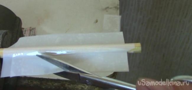 Оперение для такой стрелы можно сделать при помощи обычного скотча. Для этого просто приклеиваем скотч с двух сторон и вырезаем лишние части, придав оперению треугольную форму.