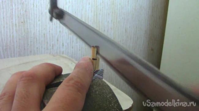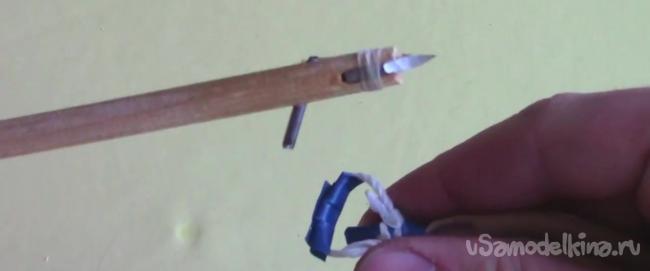 Для того, чтобы зарядить стрелы, нужно позаботиться о специальном спусковом механизме. Для его изготовления нужно проделать недалеко от наконечника отверстие под углом 45 градусов и поместить в нем отрезок гвоздя.