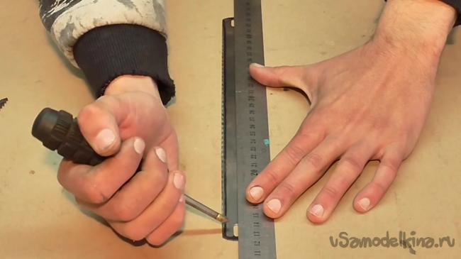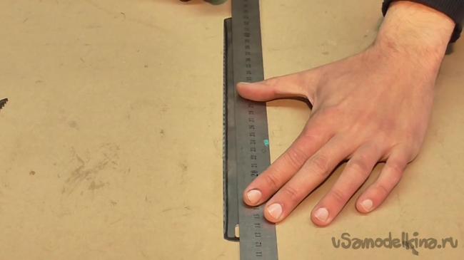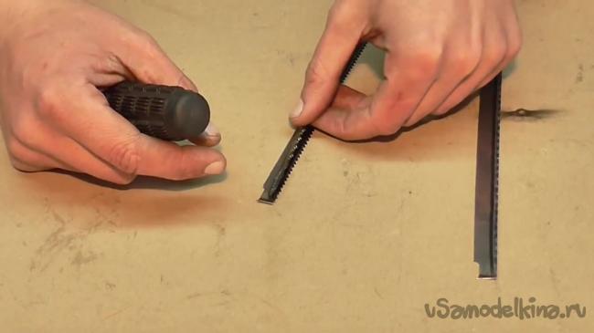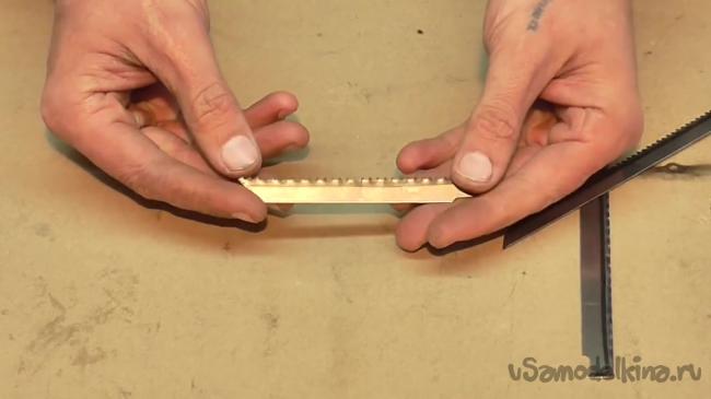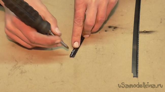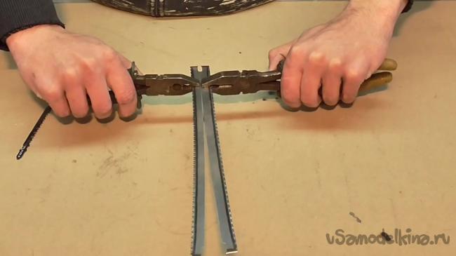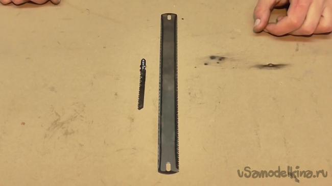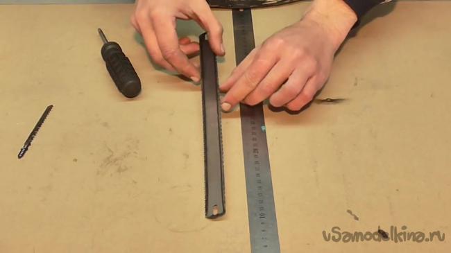 Для начала берем линейку и делим ножовочное полотно пополам вдоль.