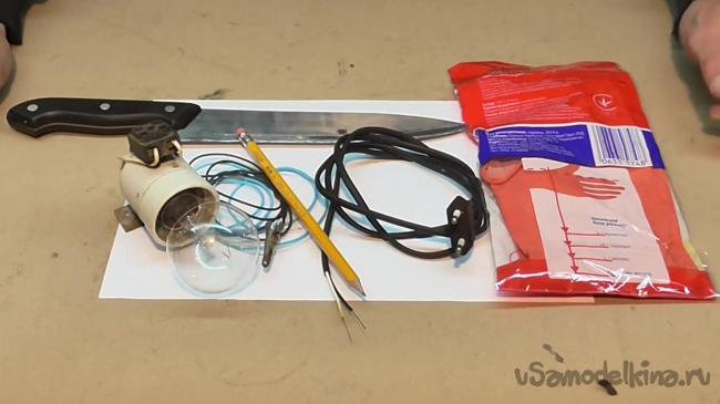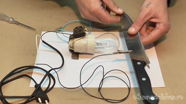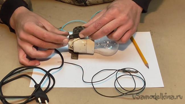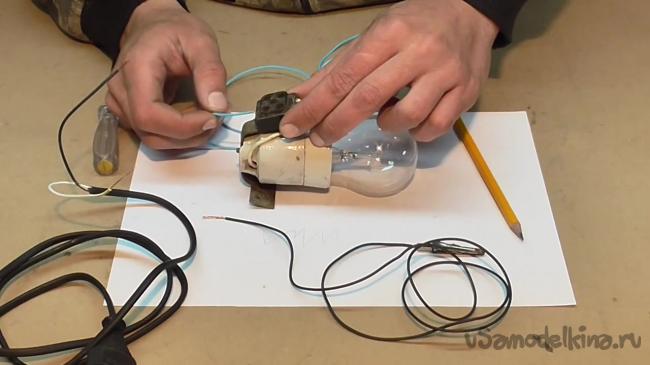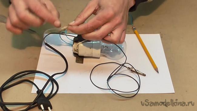 Основная работа сделана. Теперь можно позаботиться о правильном подключении электрического карандаша. Провод, который идет от карандаша, подсоединяем к одному выводу лампочки.