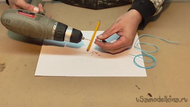 Автор наносит рисунок на нержавеющем ноже, но как мы сказали выше, можно использовать любой токопроводящий материал. Приступим к превращению обычного карандаша в электрический. Для этого на конце карандаша нужно подсоединить провод к графиту. Для этого снимаем ластик и просверливаем его по центру тонким сверлом.