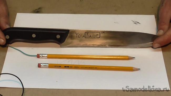 Каждому известно, что в карандаше установлен графит, который хорошо передает ток. Это свойство можно использовать для создания электрического карандаша, благодаря которому можно с легкостью делать гравировку на ножах и других токопроводящих поверхностях.