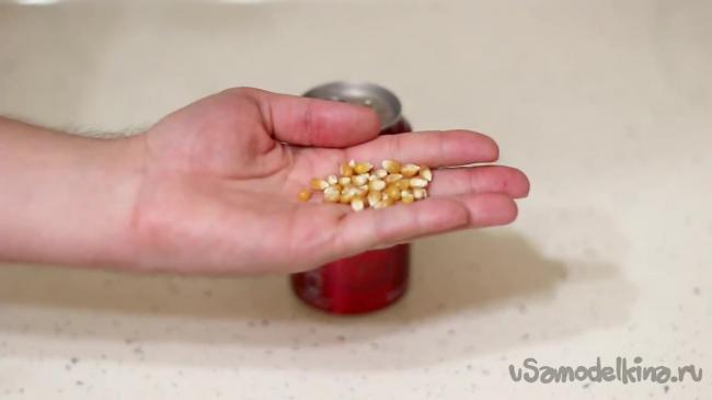 Наша миниатюрная попкорница готова. Теперь можно залить в нее совсем немного масла, чтобы покрыть дно баночки.