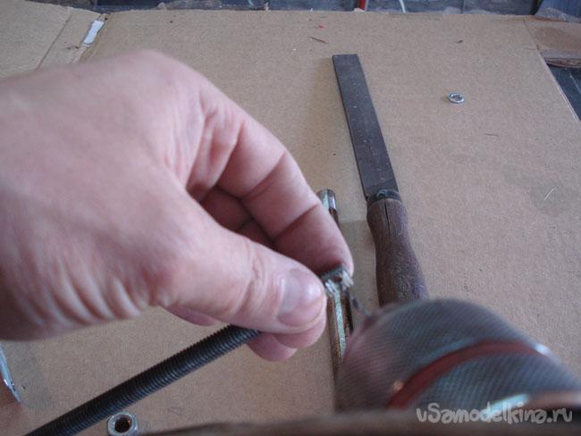 Стачиваем резьбу в плоскость, чтобы проще было просверлить отверстие под шпонку.