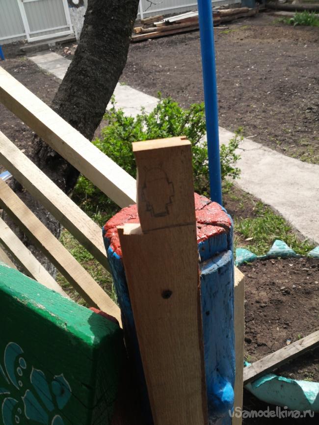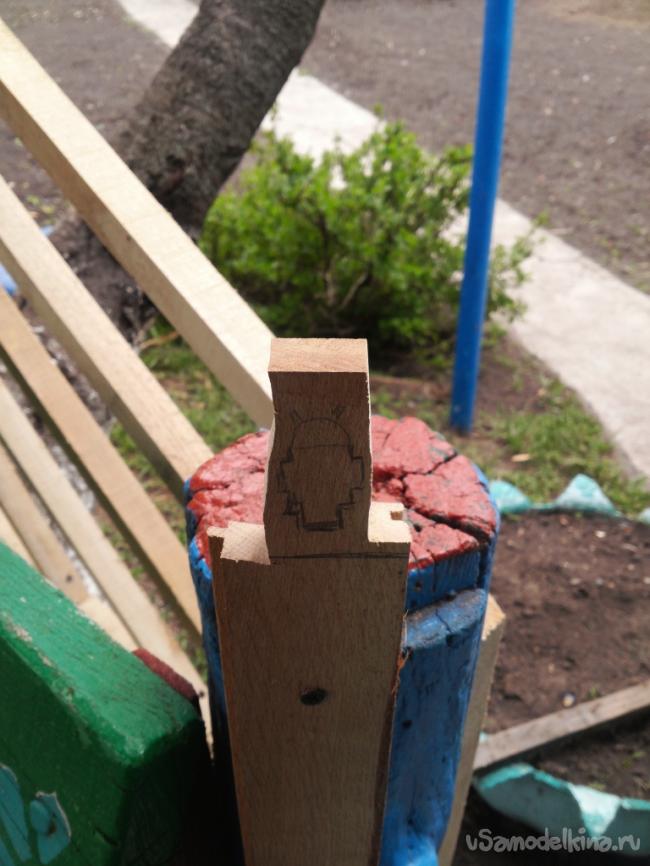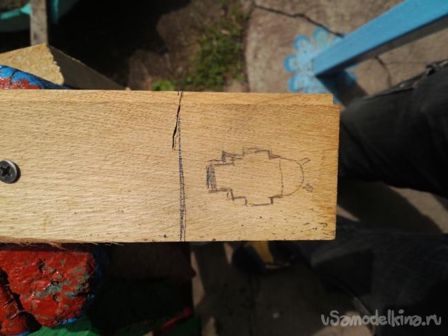 Далее нужно сделать контур андроида, по нему и будет производиться распиловка лобзиком. У нашего андроида, как и у всех будут уши, голова с выделенной шеей, руки и ножки. Когда контур готов можно зажимать паркет в тиски и приступать к выпиливанию частей.