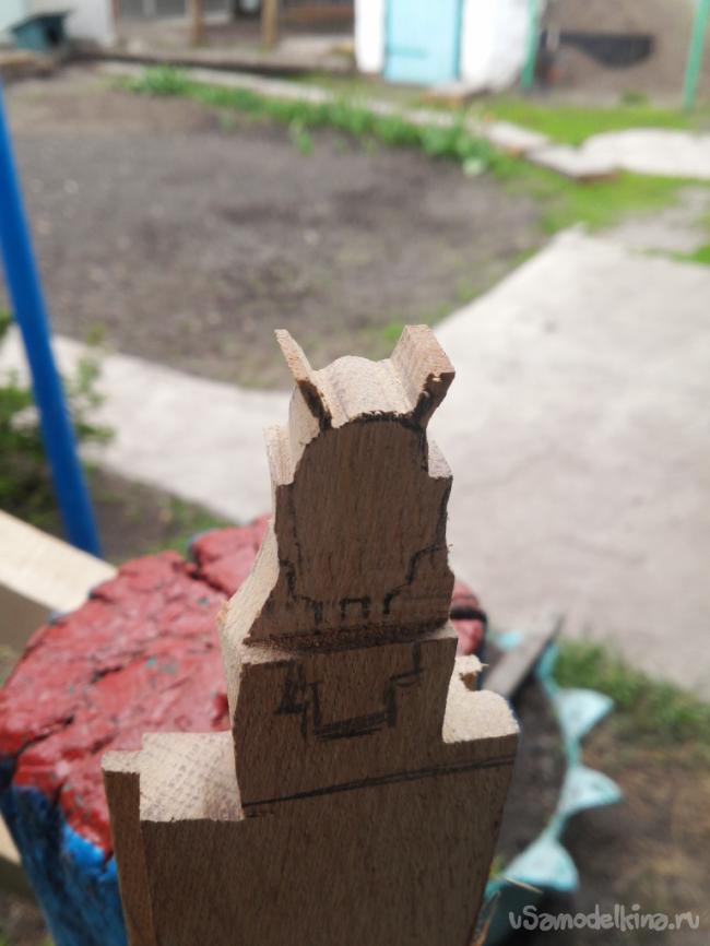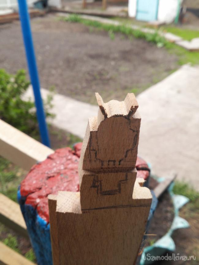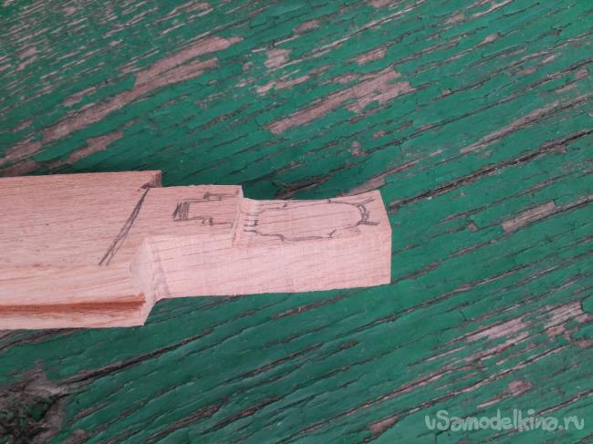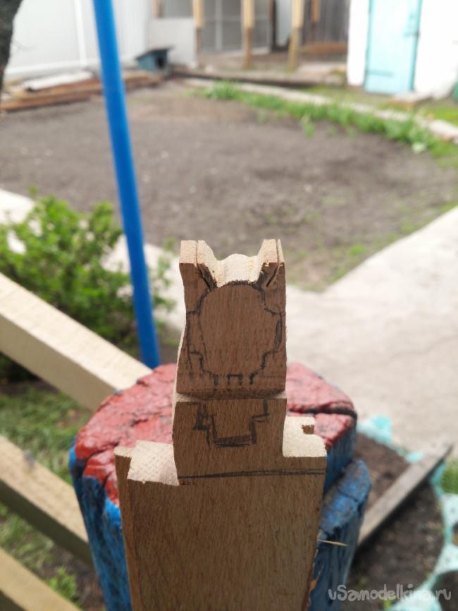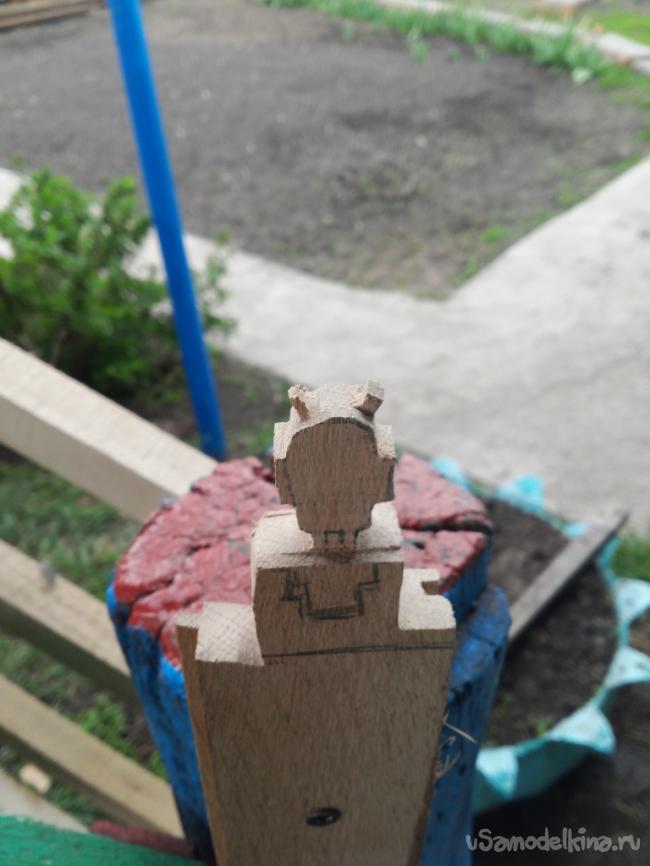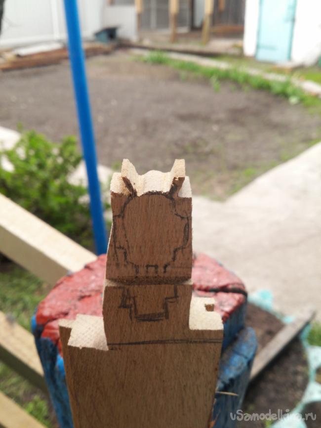 Выпилив предыдущую часть тела брелка переходим к нижней части, то есть к ногам и туловищу. Лобзиком вырезаем по отмеченной линии, чтобы получилось так, как на фото.