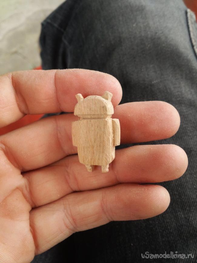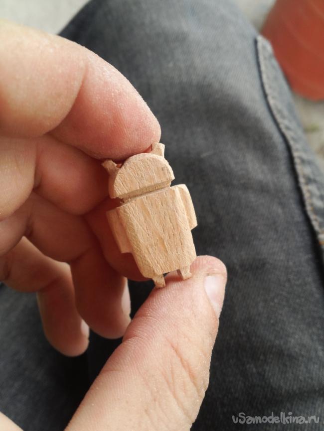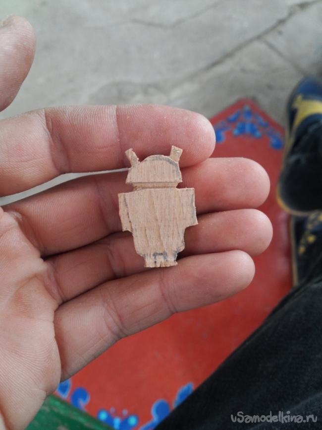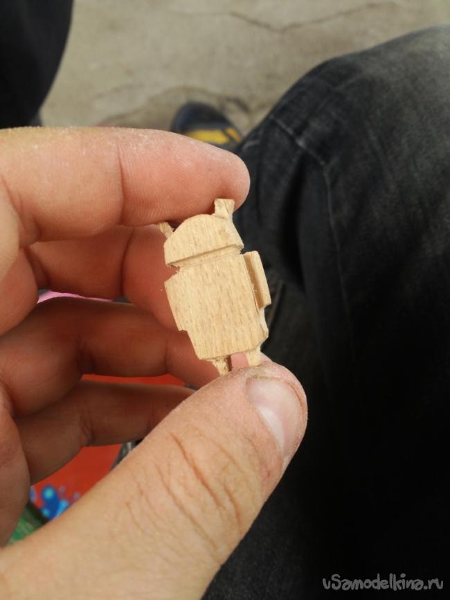 Когда основа для ушей уже выпилена, можно заняться выпиливанием рук брелка, просто выпилив лобзиком край справа и слева немного внизу от ушей. Так как андроид у нас маленький, то и руки у него будут такого же размера, ограничим их размеры с помощью лобзика.