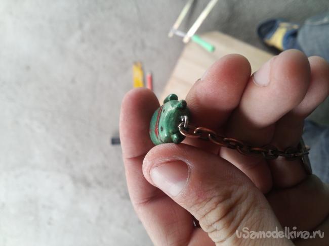 В завершении брелок можно покрасить в зеленый цвет с элементами красного, а в голове сделать кольцо, для того чтобы повесить его цепочку ключей.